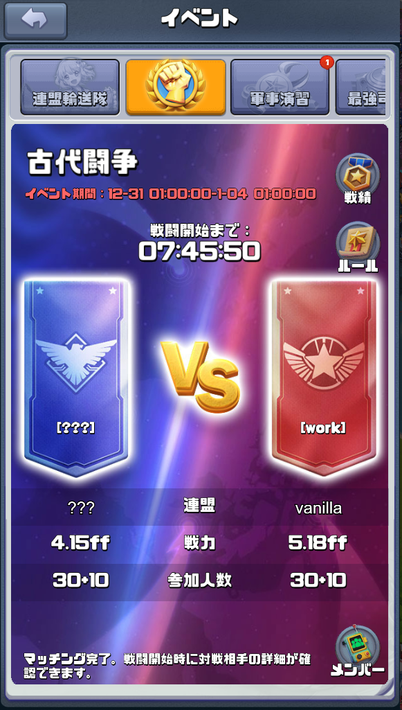 また、マッチング完了後、相手の戦力と人数は確認できるが、試合まではサーバー名や連盟名は判らない。