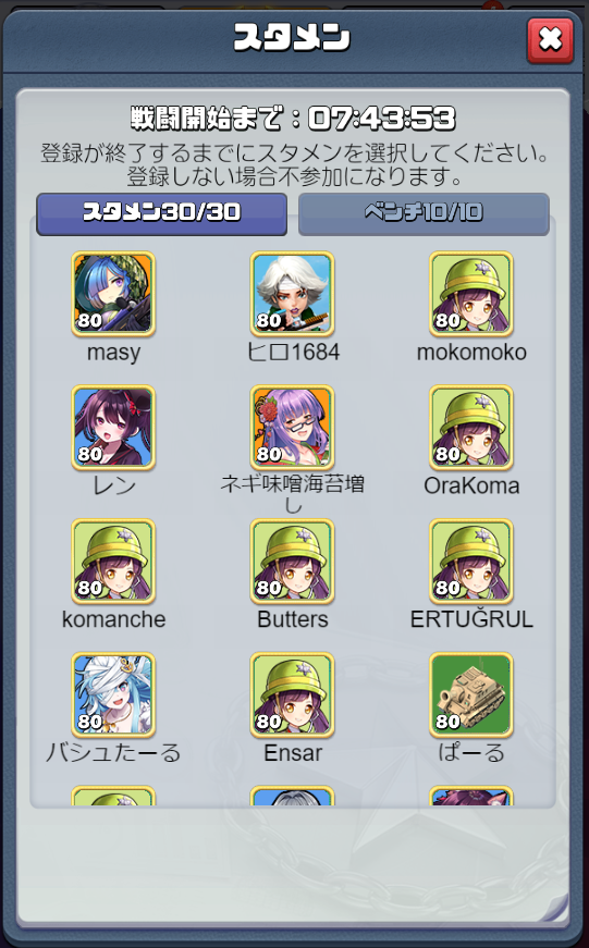 盟主が、連盟員の中から30人のスタメンと、10人のベンチに入るメンバーを選抜する。最初は申し込み時に自動で選択される。