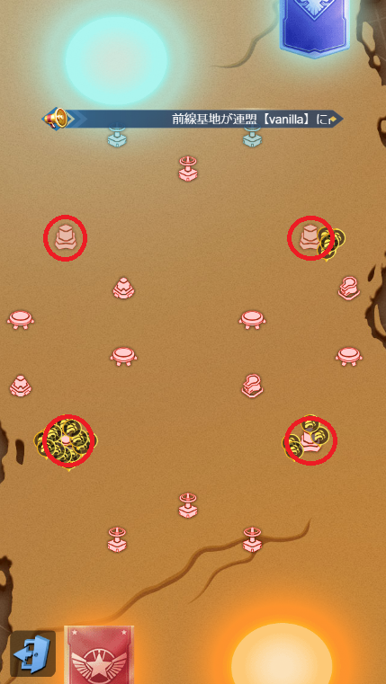 上記地図の赤丸部分は中継エリアで、占領するとその周辺へ移転が可能になる。