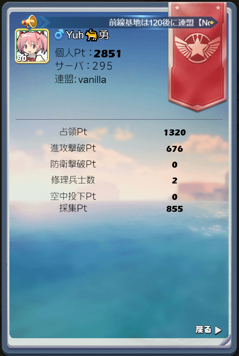 個人成績のページでは進行撃破と防衛撃破で判れており、それぞれにポイントがあったのだが、連盟ポイントのほうは0だった。