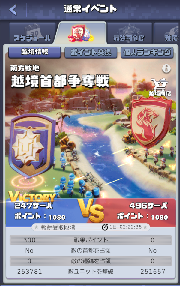 残り30分で首都への攻撃が可能になり、一気に首都を取りに行く作戦が成功し最初のポイントを無事に確保する。