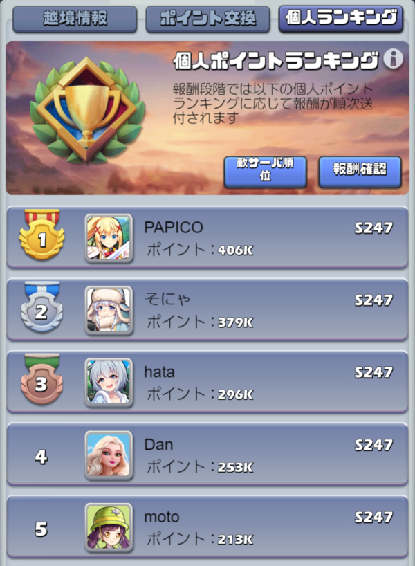 PAPICOさんが前回に続いて、2回連続1位でした。(あれだけ、首都で弾き返していればね・・・と思ってしまった。防御で稼いだというのが凄まじい・・・)