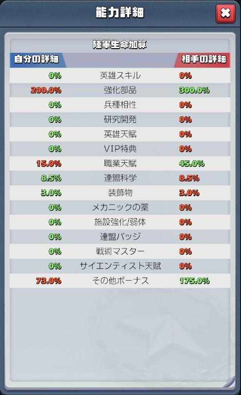 この場合、NPC戦での戦報ログですが、戦車生命の能力詳細を見ると、連盟科学のところで8.5%上がっているのが判ります。