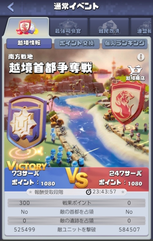 結局は3回ほど維持をされて敗けてしまう。撃破ポイントではS247のほうが勝っていたようで、なんとか首都を守りきれればまだチャンスはあったかもしれないが、総合敵にS73のほうが層が厚かったと感じた。