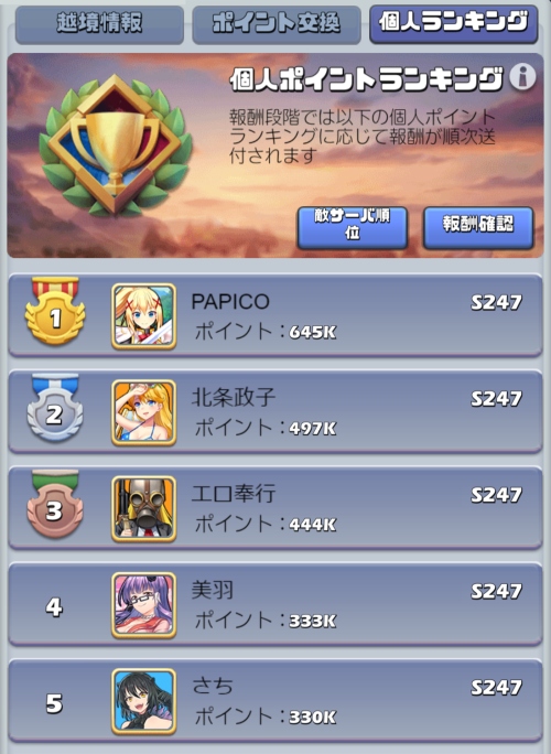 ただ、ビビッドアーミーの戦闘の場合、全体の戦力よりも上位陣がどれだけ参加してどれだけ長時間戦闘をするかの影響が大きい為、一概にS73が勝つとは言えない。
